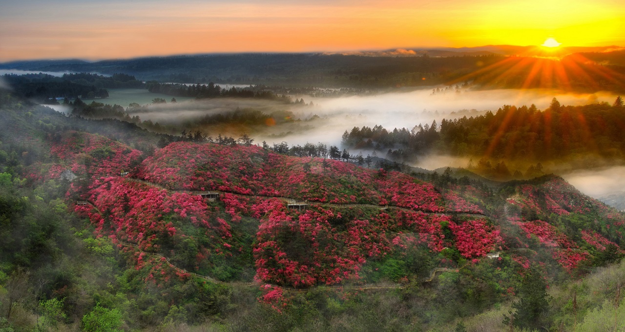 云霧山原名礦山,是武漢市最大的城市郊野公園,方圓25平方公里,主峰海拔709米,屬武漢市最高峰。木蘭云霧山為木蘭八景之一,國家5A級旅游景區(qū)。“十里花山,八里柳溪,一山兩教,四季香火”, 尤其是進入四月,聽到的都是呢喃鳥語,聞到的是花草馨香,漫山遍野,目力所及之處,無一不是杜鵑花的世界,杜鵑花的海洋。